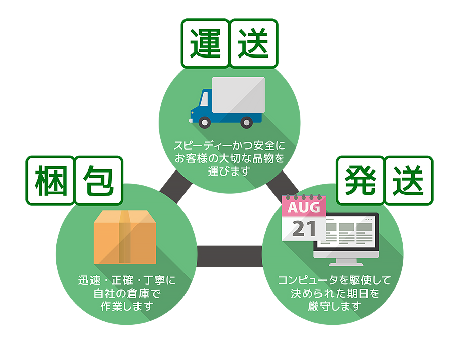 「梱包」迅速・正確・丁寧に自社の倉庫で作業します。 「発送」コンピュータを駆使して決められた期日を厳守します。